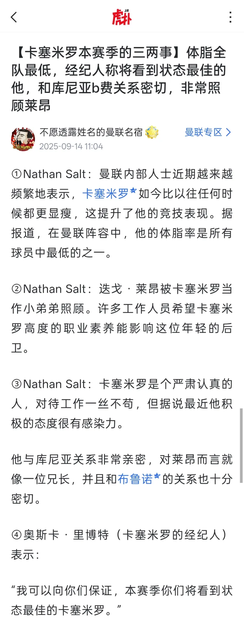 卡塞米罗兑现了经纪人赛季初的卡塞承诺,这赛季确实看到了状态最佳的米罗他由不愿透露姓名的曼联名宿 发表在曼联专区 http://bbs.hupu.com/manutd